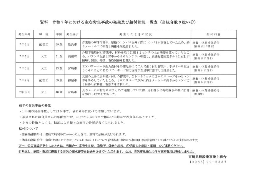 また、「令和7年における主な労災事故の発生状況及び給付状況一覧表」を同封しています。