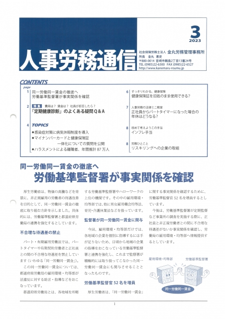 人事労務通信今月号の主な内容は、次のとおりです。