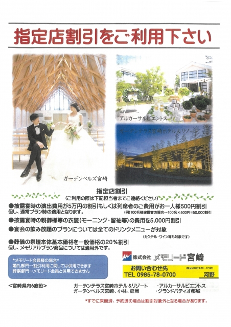 (株)セレモニー宮崎のガーデンベルズ、アルカーサルビエントス、ガーデンテラス宮崎ホテル&リゾート等の各種施設(総合結婚式場、貸衣装、総合葬祭会館)が「指定企業契約」により割引料金(20%割引)でご利用いただけます。